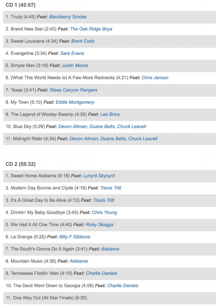 Since its inception in 1974, Charlie’s Volunteer Jam has brought together some of music’s biggest stars. This year’s Jam, which was recorded on March 7 at Nashville’s Bridgestone Arena, featured performances by Charlie Daniels, Chris Young, Lee Brice, Alabama, Sara Evans, Travis Tritt, Alison Krauss, Billy Gibbons of ZZ Top, Blackberry Smoke, Bobby Bare, Chris Janson, Chuck Leavell, Eddie Montgomery, Jamey Johnson, Justin Moore, The Oak Ridge Boys, Ricky Skaggs and more.