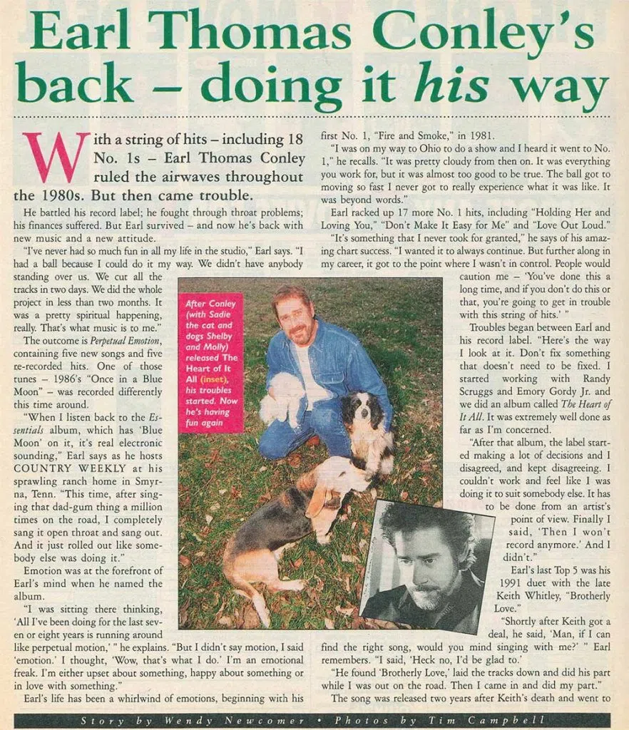NCD combed its archives and found an interview with Earl from the April 7, 1998, issue of Country Weekly magazine, penned by Wendy Newcomer with photos by Tim Campbell.
